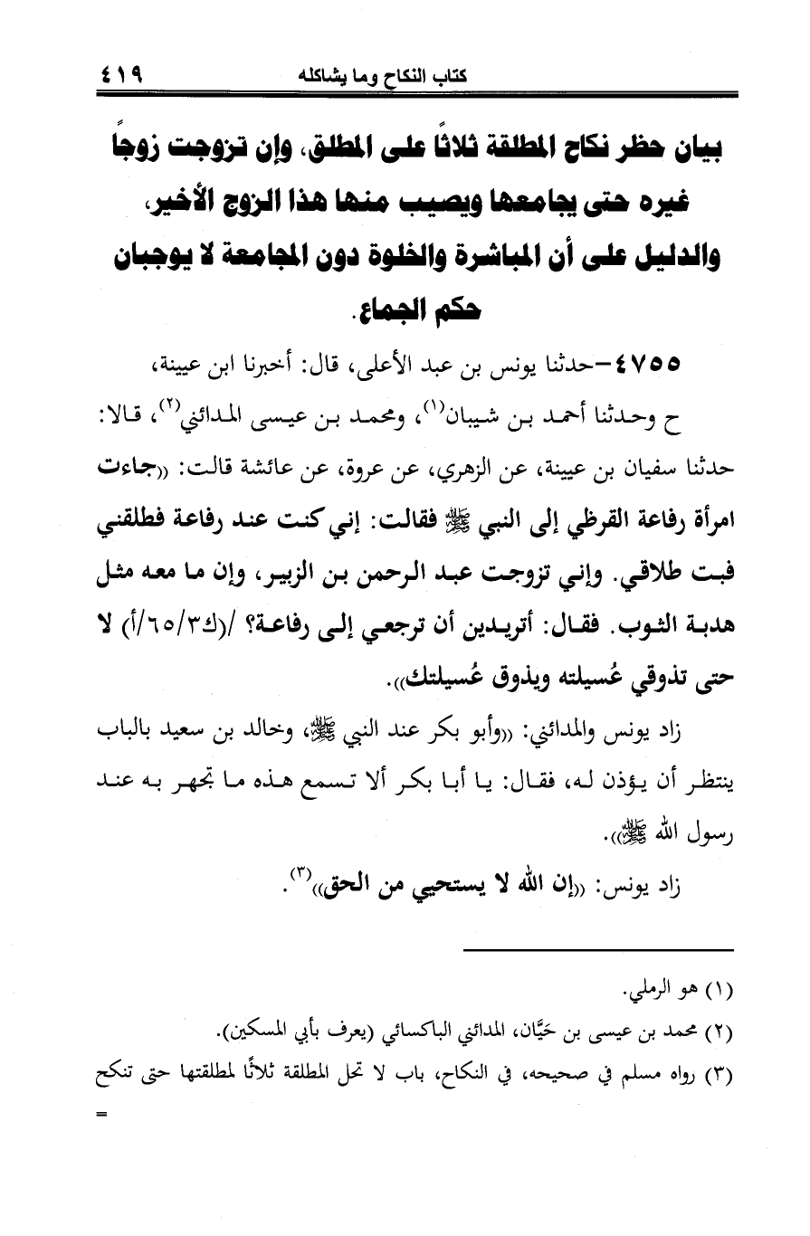 (¬3) رواه مسلم في صحيحه، في النِّكاح، باب لا تحل المطلقة ثلاثا لمطلقتها حتّى تنكح =