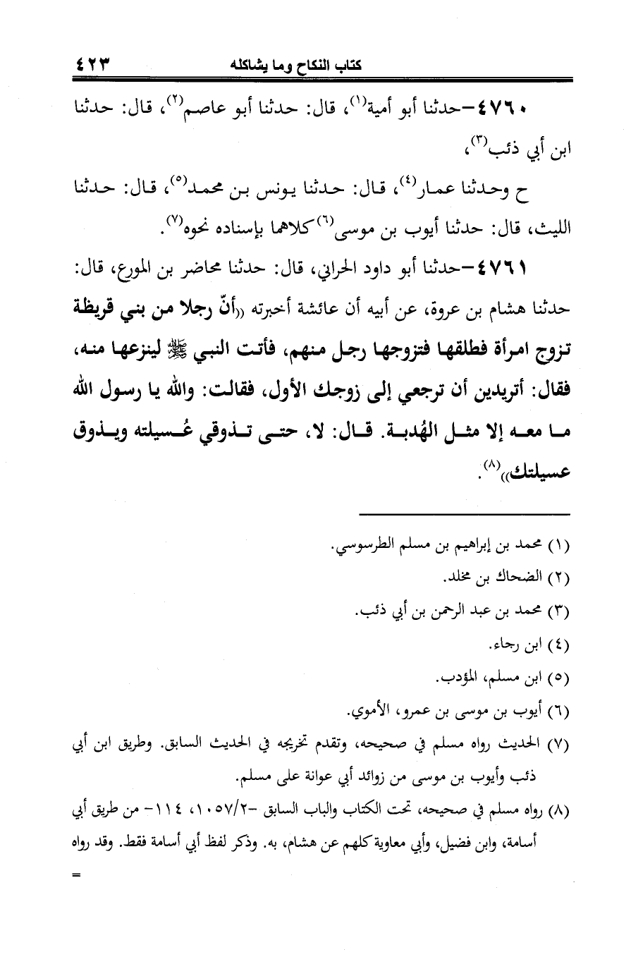 4761 - حدّثنا أبو داود الحراني، قال: حدثنا محاضر بن المورع، قال: حدّثنا هشام بن عروة، عن أبيه أن عائشة أخبرته "أنَّ رجلا من بني قريظة تزوج امرأة فطلقط فتزوجها رجل منهم، فأتت النّبيّ -صلى الله عليه وسلم- لينزعها منه، فقال: أتريدين أن ترجعي إلى زوجك الأوّل، فقالت: والله يا رسول الله ما معه إِلَّا مثل الهُدبة. قال: لا، حتّى تذوقي عُسيلته ويذوق عسيلتك" (¬1).