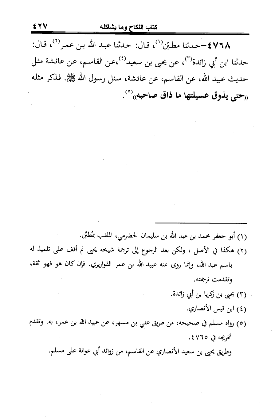 4768 - حدّثنا مطيّن (¬1)، قال: حدّثنا عبد الله بن عمر (¬2)، قال: حدّثنا ابن أبي زائدة (¬3)، عن يحيى بن سعيد (¬4)، عن القاسم، عن عائشة مثل حديث عبيد الله، عن القاسم، عن عائشة، سئل رسول الله -صلى الله عليه وسلم-. فذكر مثله "حتّى يذوق عسيلتها ما ذاق صاحبه" (¬5).