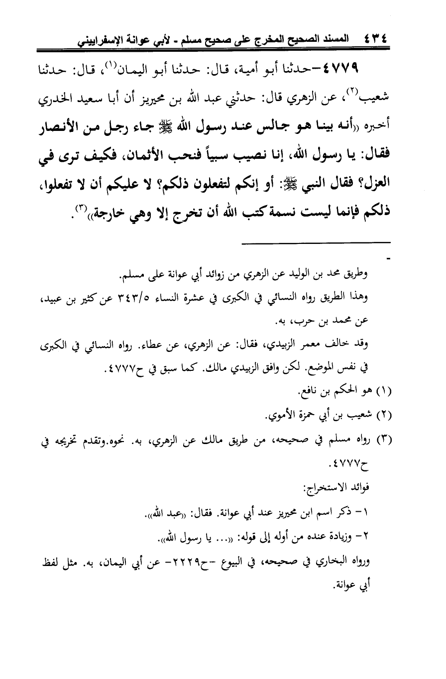 4779 - حدّثنا أبو أمية، قال: حدّثنا أبو اليمان (¬1)، قال: حدّثنا شعيب (¬2)، عن الزّهريّ قال: حدثني عبد الله بن محيريز أن أبا سعيد الخدري أخبره "أنه بيَّنَّا هو جالس عند رسول الله -صلى الله عليه وسلم- جاء رجل من الأنصار فقال: يا رسول الله، إنا نصيب سبيًا فنحب الأثمان، فكيف ترى في العزل؟ فقال النّبيّ -صلى الله عليه وسلم-: أو إنكم لتفعلون ذلكم؟ لا عليكم أن لا تفعلوا، ذلكم فإنّما ليست نسمة كتب الله أن تخرج إِلَّا وهي خارجة" (¬3).