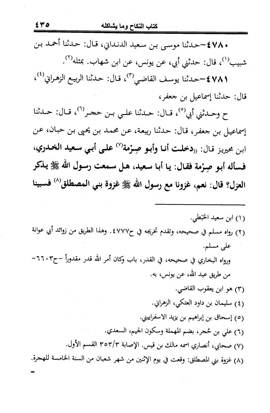 (¬8) رواه مسلم في صحيحه، في النِّكاح، في أول باب حكم العزل -12/ 106، ح 125 - عن يحيى بن أيوب وقتيبة بن سعيد، وعلي بن حُجر، قالوا: حدّثنا إسماعيل بن جعفر، به. مثله.
