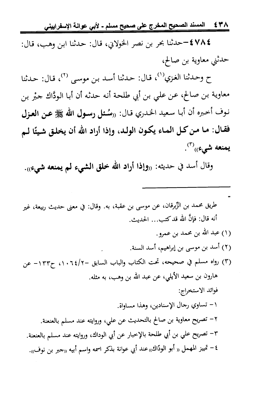 4784 - حدّثنا بحر بن نصر الخولاني، قال: حدّثنا ابن وهب، قال: حدثني معاوية بن صالح، ح وحدثنا الغزي (¬1)، قال: حدّثنا أسد بن موسى (¬2)، قال: حدّثنا معاوية بن صالح، عن علي بن أبي طلحة أنه حدثه أن أبا الودَّاك جبْر بن نوف أخبره أن أبا سعيد الخدري قال: "سُئل رسول الله -صلى الله عليه وسلم- عن العزل فقال: ما من كلّ الماء يكون الولد، وإذا أراد الله أن يخلق شيئًا لم يمنعه شيء" (¬3).