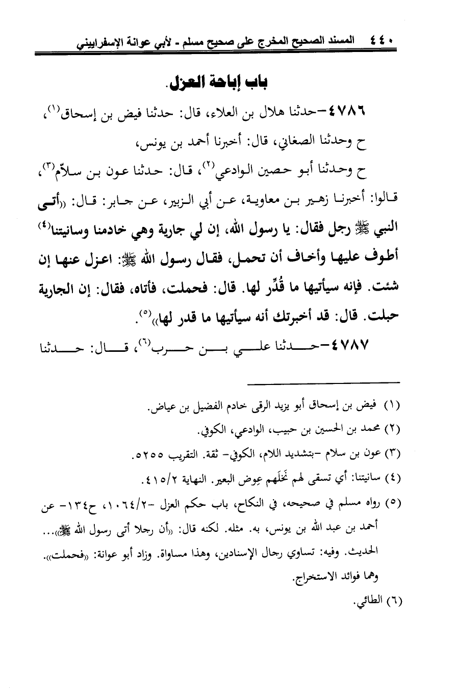 (¬5) رواه مسلم في صحيحه، في النِّكاح، باب حكم العزل-2/ 1064، ح 134 - عن أحمد بن عبد الله بن يونس، به. مثله. لكنه قال: "أن رجلا أتى رسول الله -صلى الله عليه وسلم-" ... الحديث. وفيه: تساوي رجال الإسنادين، وهذا مساواة. وزاد أبو عوانة: "فحملت".