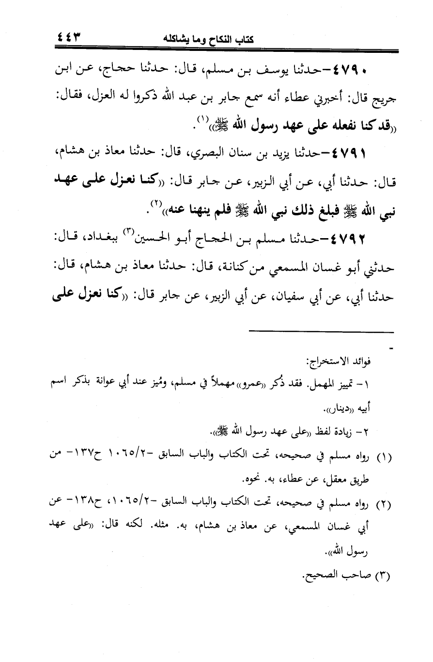 4792 - حدّثنا مسلم بن الحجاج أبو الحسين (¬1) ببغداد، قال: حدثني أبو غسان المسمعي من كنانة، قال: حدّثنا معاذ بن هشام، قال: حدّثنا أبي، عن أبي سفيان، عن أبي الزبير، عن جابر قال: "كنا نعزل على