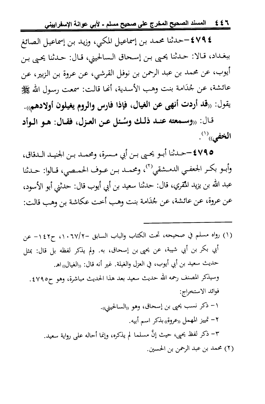 (¬1) رواه مسلم في صحيحه، تحت الكتاب والباب السابق-2/ 1067، ح 142 - عن أبي بكر بن أبي شيبة، عن يحيى بن إسحاق، به. ولم يذكر لفظه بل قال: بمثل حديث سعيد بن أبي أيوب، في العزل والغيلة. غير أنه قال: "الغيال" اهـ.