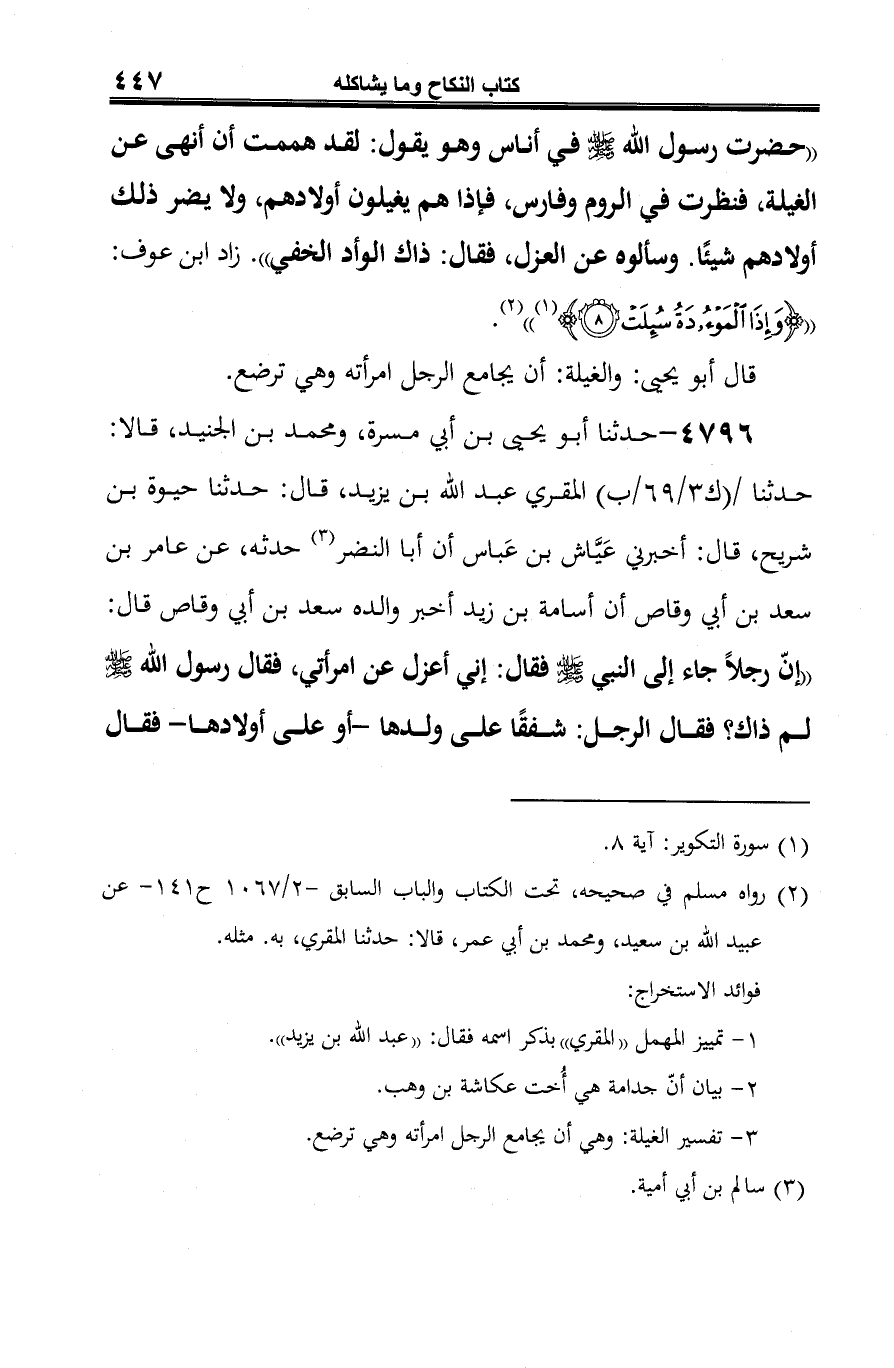4796 - حدّثنا أبو يحيى بن أبي مسرة، ومحمد بن الجنيد، قالا: حدّثنا المقري عبد الله بن يزيد، قال: حدّثنا حيوة بن شريح، قال: أخبرني عَيَّاش بن عَباس أن أبا النضر (¬1) حدثه، عن عامر بن سعد بن أبي وقّاص أن أسامة بن زيد أخبر والده سعد بن أبي وقّاص قال: "إن رجلًا جاء إلى النّبيّ -صلى الله عليه وسلم- فقال: إنِّي أعزل عن امرأتي، فقال رسول الله -صلى الله عليه وسلم- لم ذاك؟ فقال الرَّجل: شفقًا على ولدها -أو على أولادها- فقال
