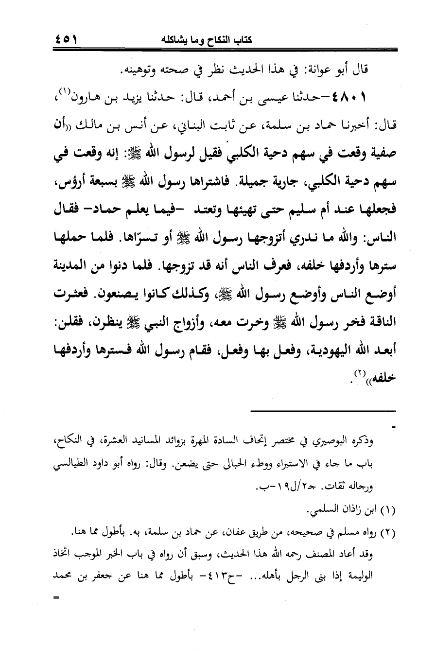 4801 - حدّثنا عيسى بن أحمد، قال: حدّثنا يزيد بن هارون (¬1)، قال: أخبرنا حماد بن سلمة، عن ثابنت البناني، عن أنس بن مالك "أن صفية وقعت في سهم في حية الكلبي فقيل لرسول الله -صلى الله عليه وسلم-: إنّه وقعت في سهم دحية الكلبي، جاهبة جميلة. فاشتراها رسول الله -صلى الله عليه وسلم- بسبعة أرؤس، فجعلها عند أم سليم حتّى تهيئها وتعتد -فيما يعلم حماد- فقال النَّاس: والله ما ندري أتزوجها رسول الله -صلى الله عليه وسلم- أو تسرّاها. فلما حملها سترها وأردفها خلفه، فعرف النَّاس أنه قد تزوجها. فلما دنوا من المدينة أوضع النَّاس وأوضع رسول الله -صلى الله عليه وسلم-، وكذلك كانوا يصنعون. فعثرت الناقة فخر رسول الله -صلى الله عليه وسلم- وخرت معه، وأزواج النّبيّ -صلى الله عليه وسلم- ينظرن، فقلن: أبعد الله اليهودية، وفعل بها وفعل، فقام رسول الله فسترها وأردفها خلفه" (¬2).