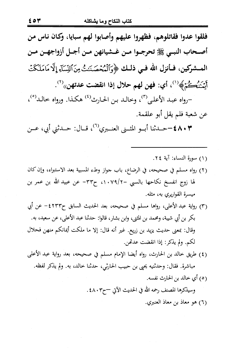 -[454]- شعبة، عن قتادة، وعثمان البتّي (¬2)، عن صالح أبي الخليل (¬3)، عن أبي سعيد الخدري قال: "أصاب النَّاس سبايا يوم أوطاس، لهنّ أزواج، فنكحوهم (¬4) ثمّ هابوا ذلك، فنزلت {وَالْمُحْصَنَاتُ مِنَ النِّسَاءِ إِلَّا مَا مَلَكَتْ أَيْمَانُكُمْ} أي: لا بأس بنكاحهن" (¬5).