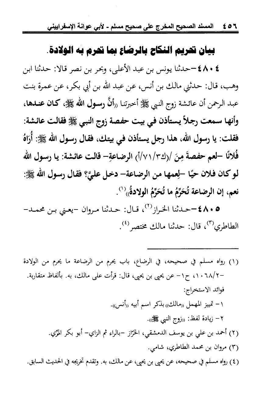 (¬1) رواه مسلم في صحيحه، في الرضاع، باب يحرم من الرضاعة ما يحرم من الولادة -2/ 1068، ح 1 - عن يحيى بن يحيى، قال: قرأت على مالك، به. بألفاظ متقاربة.