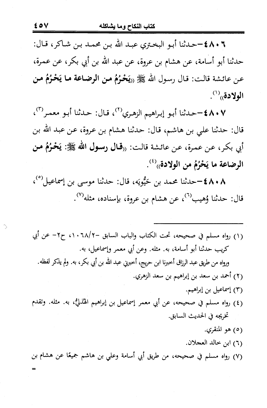 4806 - حدّثنا أبو البختري عبد الله بن محمّد بن شاكر، قال: حدّثنا أبو أسامة، عن هشام بن عروة، عن عبد الله بن أبي بكر، عن عمرة، عن عائشة قالت: قال رسول الله -صلى الله عليه وسلم- "يَحْرُمُ من الرضاعة ما يَحْرُمُ من الولادة" (¬1).