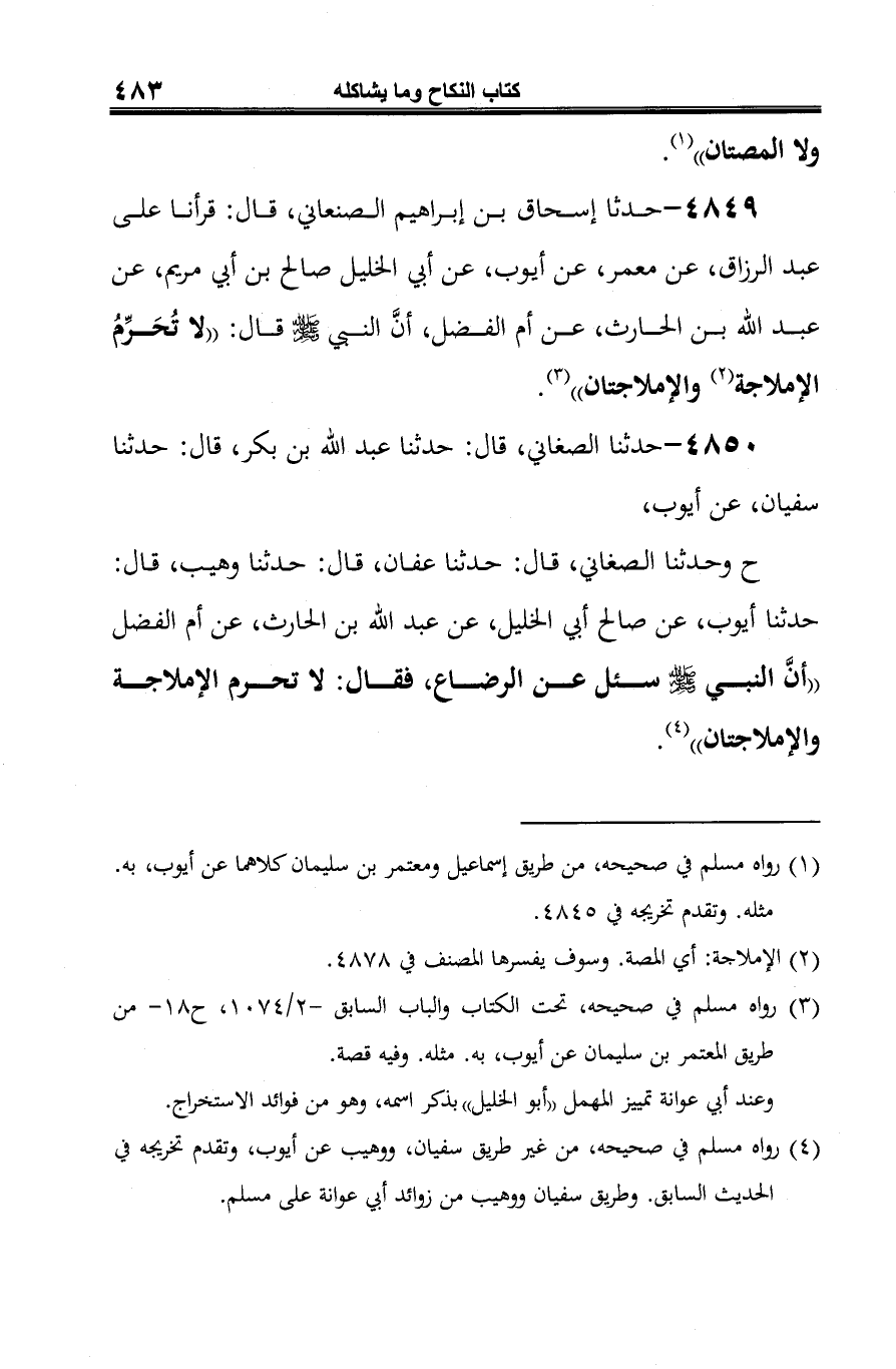 4850 - حدّثنا الصغاني، قال: حدّثنا عبد الله بن بكر، قال: حدّثنا سفيان، عن أيوب، ح وحدثنا الصغاني، قال: حدّثنا عفان، قال: حدّثنا وهيب، قال: حدّثنا أيوب، عن صالح أبي الخليل، عن عبد الله بن الحارث، عن أم الفضل "أنَّ النّبيّ -صلى الله عليه وسلم- سئل عن الرضاع، فقال: لا تحرم الإملاجة والإملاجتان" (¬1).