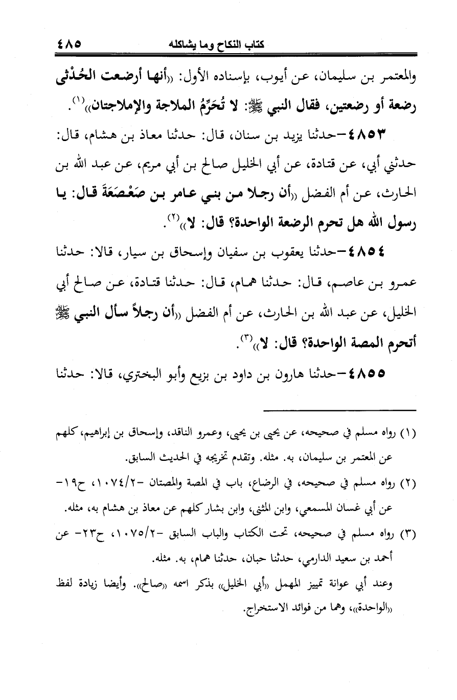 4853 - حدّثنا يزيد بن سنان، قال: حدّثنا معاذ بن هشام، قال: حدثني أبي، عن قتادة، عن أبي الخليل صالح بن أبي مريم، عن عبد الله بن الحارث، عن أم الفضل "أن رجلا من بني عامر بن صَعْصَعَةَ قال: يا رسول الله هل تحرم الرضعة الواحدة؟ قال: لا" (¬1).
