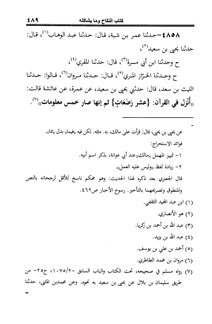 ح وحدثنا الخرّاز المري (¬5)، قال: حدّثنا مروان (¬6)، قالوا: حدّثنا اللَّيث بن سعد، قال: حدثني يحيى بن سعيد، عن عمرة، عن عائشة قالت: "أُنْزل في القرآن: {عشر رَضَعَاتٍ} ثمّ إنها صار خمس معلومات" (¬7).