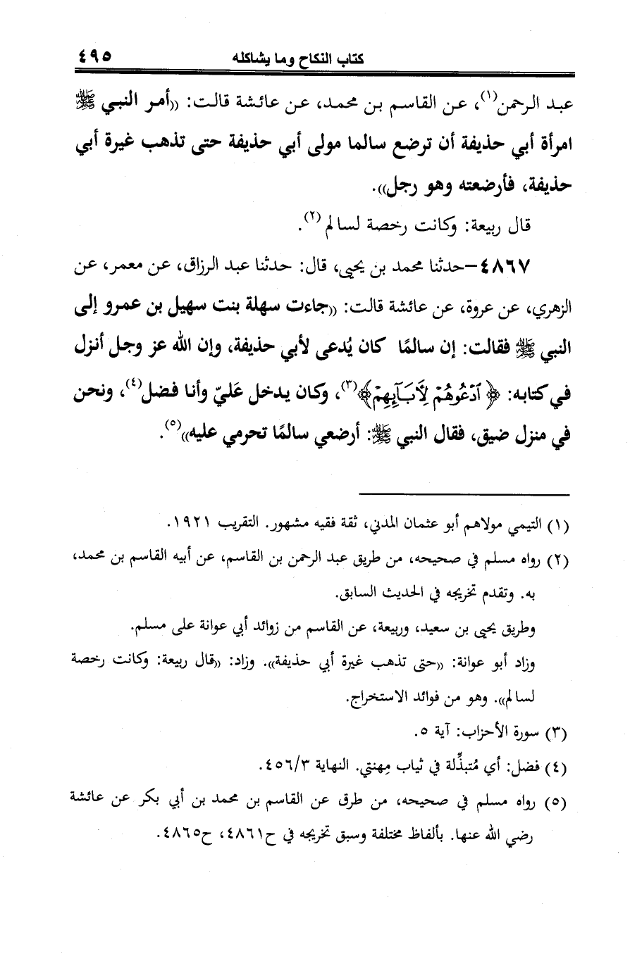 4867 - حدّثنا محمّد بن يحيى، قال: حدّثنا عبد الرزّاق، عن معمر، عن الزّهريّ، عن عروة، عن عائشة قالت: "جاءت سهلة بنت سهيل بن عمرو إلى النّبيّ -صلى الله عليه وسلم- فقالت: إن سالمًا كان يُدعى لأبي حذيفة، وإنَّ الله -عَزَّ وَجَلَّ- أنزل في كتابه: {ادْعُوهُمْ لِآبَائِهِمْ} (¬1)، وكان يدخل عَليّ وأنا فضل (¬2)، ونحن في منزل ضيق، فقال النّبيّ -صلى الله عليه وسلم-: أرضعي سالمًا تحرمي عليه" (¬3).