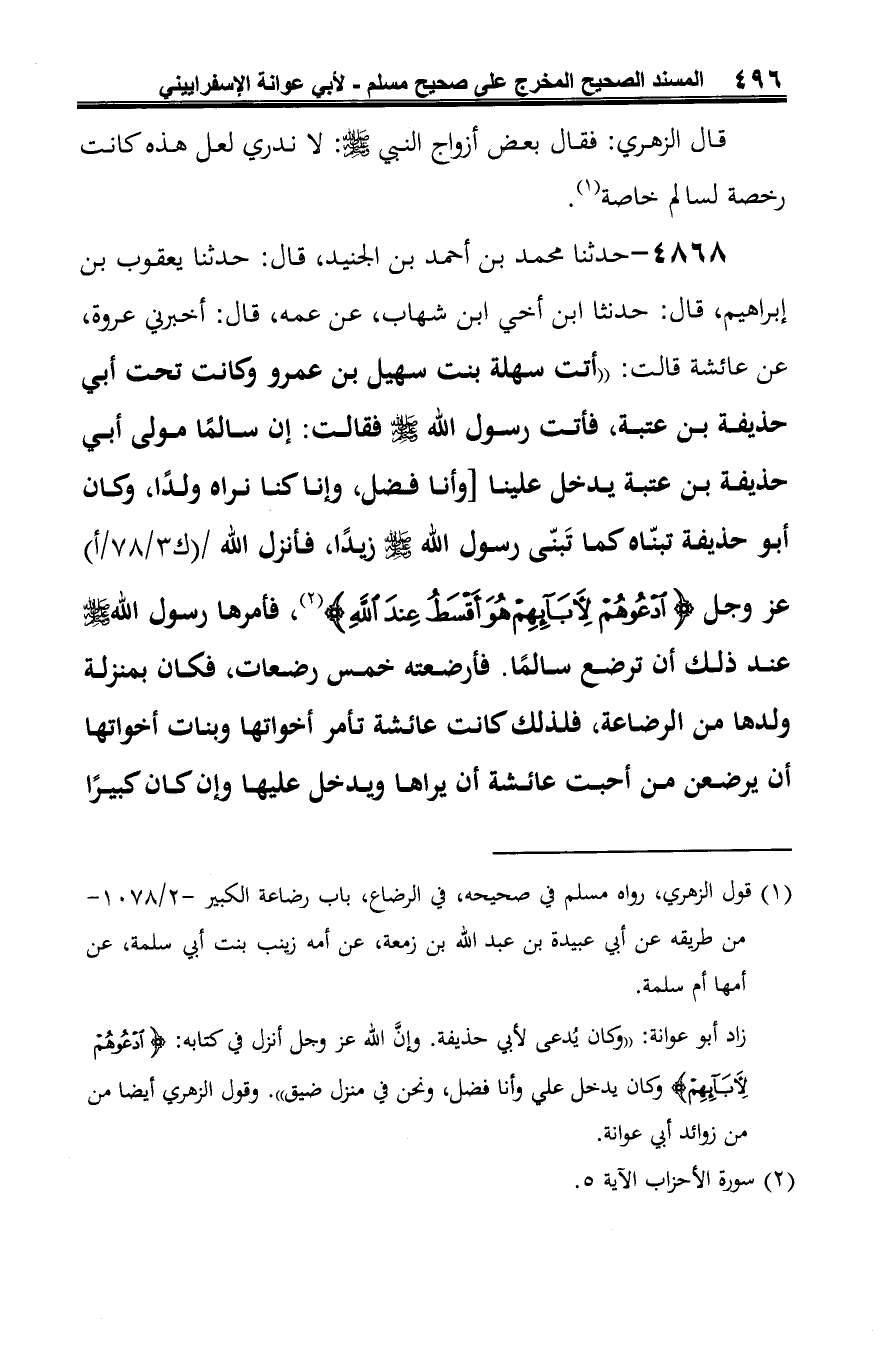 4868 - حدثنا محمد بن أحمد بن الجنيد، قال: حدثنا يعقوب بن إبراهيم، قال: حدثنا ابن أخي ابن شهاب، عن عمه، قال: أخبرني عروة، عن عائشة قالت: "أتت سهلة بنت سهيل بن عمرو وكانت تحت أبي حذيفة بن عتبة، فأتت رسول الله -صلى الله عليه وسلم- فقالت: إن سالمًا مولى أبي حذيفة بن عتبة يدخل علينا [وأنا فضل، وإنا كنا نراه ولدًا، وكان أبو حذيفة تبنّاه كما تَبنّى رسول الله -صلى الله عليه وسلم- زيدًا، فأنزل الله عز وجل {ادْعُوهُمْ لِآبَائِهِمْ هُوَ أَقْسَطُ عِنْدَ اللَّهِ} (¬1)، فأمرها رسول الله -صلى الله عليه وسلم- عند ذلك أن ترضع سالمًا. فأرضعته خمس رضعات، فكان بمنزلة ولدها من الرضاعة، فلذلك كانت عائشة تأمر أخواتها وبنات أخواتها أن يرضعن من أحبت عائشة أن يراها ويدخل عليها وإن كان كبيرًا