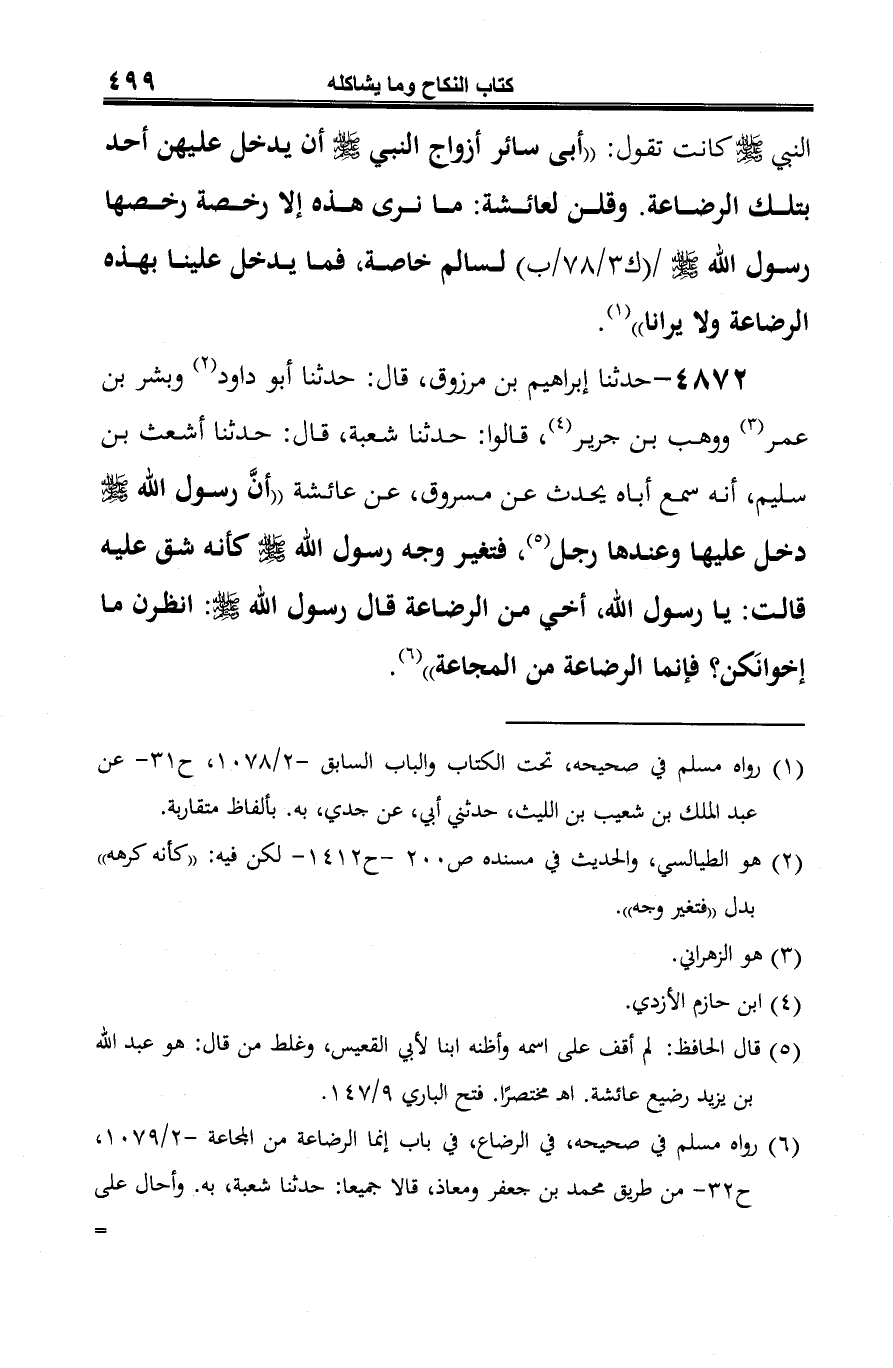 4872 - حدّثنا إبراهيم بن مرزوق، قال: حدّثنا أبو داود (¬1) وبشر بن عمر (¬2) ووهب بن جرير (¬3)، قالوا: حدّثنا شعبة، قال: حدّثنا أشعث بن سليم، أنه سمع أباه يحدث عن مسروق، عن عائشة "أنَّ رسول الله -صلى الله عليه وسلم- دخل عليها وعندها رجل (¬4)، فتغير وجه رسول الله -صلى الله عليه وسلم- كأنّه شق عليه قالت: يا رسول الله، أخي من الرضاعة قال رسول الله -صلى الله عليه وسلم-: انظرن ما إخوانَكن؟ فإنّما الرضاعة من المجاعة" (¬5).