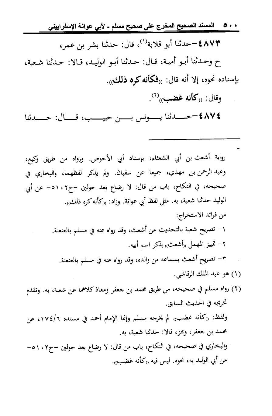 (¬2) رواه مسلم في صحيحه، من طريق معاذ ومحمد بن جعفر كلاهما عن شعبة، به. نحوه وتقدم تخريجه في ح 4872 - وعند أبي عوانة تصريح أشعث بسماعه من أبيه، وأيضا تساوي رجال إسناده مع مسلم، وهما من فوائد الاستخراج.