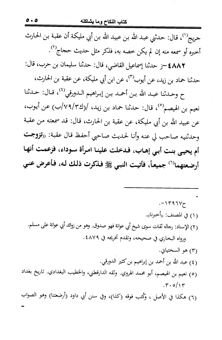 4882 - ز حدّثنا إسماعيل القاضي، قال: حدّثنا سليمان بن حرب، قال: حدّثنا حماد بن زيد، عن أيوب (¬1)، عن ابن أبي مليكة، عن عقبة بن الحارث، ح وحدثنا عبد الله بن أحمد بن إبراهيم الدورقي (¬2)، قال: حدّثنا نعيم بن الهيصم (¬3)، قال: حدّثنا حماد بن زيد، عن أيوب، عن عبيد الله بن أبي مليكة، عن عقبة بن الحارث، قال: قد سمعته من عقبة وحدثنيه صاحب لي عنه وأنا لحديث صاحبي أحفظ قال عقبة: "تزوجت أم يحيى بنت أبي إهاب، فدخلت علينا امرأة سوداء، فزعمت أنها أرضعتهما (¬4) جميعًا، فأتيت النّبيّ -صلى الله عليه وسلم- فذكرت ذلك له، فأعرض عني