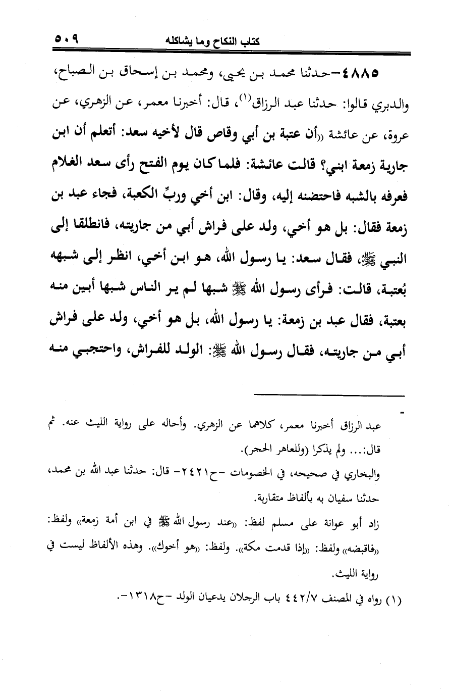 4885 - حدّثنا محمّد بن يحيى، ومحمد بن إسحاق بن الصباح، والدبري قالوا: حدّثنا عبد الرزّاق (¬1)، قال: أخبرنا معمر، عن الزّهريّ، عن عروة، عن عائشة "أن عتبة بن أبي وقّاص قال لأخيه سعد: أتعلم أن ابن جارية زمعة ابني؟ قالت عائشة: فلما كان يوم الفتح رأى سعد الغلام فعرفه بالشبه فاحتضنه إليه، وقال: ابن أخي وربِّ الكعبة، فجاء عبد بن زمعة فقال: بل هو أخي، ولد على فراش أبي من جاريته، فانطلقا إلى النّبيّ -صلى الله عليه وسلم-، فقال سعد: يا رسول الله، هو ابن أخي، انظر إلى شبهه بُعتبة، قالت: فرأى رسول الله -صلى الله عليه وسلم- شبها لم ير النَّاس شبها أبين منه بعتبة، فقال عبد بن زمعة: يا رسول الله، بل هو أخي، ولد على فراش أبي من جاريته، فقال رسول الله -صلى الله عليه وسلم-: الولد للفراش، واحتجبي منه