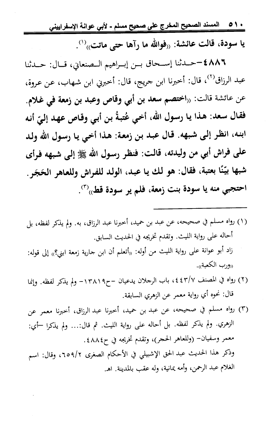 4886 - حدّثنا إسحاق بن إبراهيم الصنعاني، قال: حدّثنا عبد الرزاق (¬1)، قال: أخبرنا ابن جريج، قال: أخبرني ابن شهاب، عن عروة، عن عائشة قالت: "اختصم سعد بن أبي وقّاص وعبد بن زمعة في غلام. فقال سعد: هذا يا رسول الله، أخي عُتبةُ بن أبي وقّاص عهد إليّ أنه ابنه، انظر إلى شبهه. قال عبد بن زمعة: هذا أخي يا رسول الله ولد على فراش أبي من وليدته، قالت: فنظر رسول الله -صلى الله عليه وسلم- إلى شبهه فرأى شبها بيّنًا بعتبة، فقال: هو لك يا عبد، الولد للفراش وللعاهر الحَجَر.