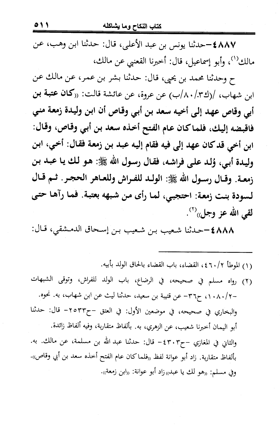 ح وحدثنا محمّد بن يحيى، قال: حدّثنا بشر بن عمر، عن مالك عن ابن شهاب، عن عروة، عن عائشة قالت: "كان عتبة بن أبي وقّاص عهد إلى أخيه سعد بن أبي وقّاص أن ابن وليدة زمعة مني فاقبضه إليك، فلما كان عام الفتح أخذه سعد بن أبي وقّاص، وقال: ابن أخي قد كان عهد إلى فيه فقام إليه عبد بن زمعة فقال: أخي، ابن وليدة أبي، وُلد على فراشه، فقال رسول الله -صلى الله عليه وسلم-: هو لك يا عبد بن زمعة. وقال رسول الله -صلى الله عليه وسلم-: الولد للفراش وللعاهر الحجر. ثمّ قال لسودة بنت زمعة: احتجبي، لما رأى من شبهه بعتبة. فما رآها حتّى لقي الله -عَزَّ وَجَلَّ-" (¬2).