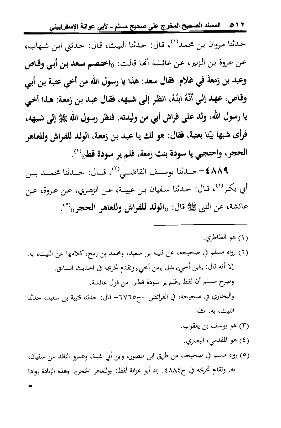 4889 - حدّثنا يوسف القاضي (¬1)، قال: حدّثنا محمّد بن أبي بكر (¬2)، قال: حدّثنا سفيان بن عيينة، عن الزّهريّ، عن عروة، عن عائشة، عن النبي -صلى الله عليه وسلم- قال: "الولد للفراش وللعاهر الحجر" (¬3).