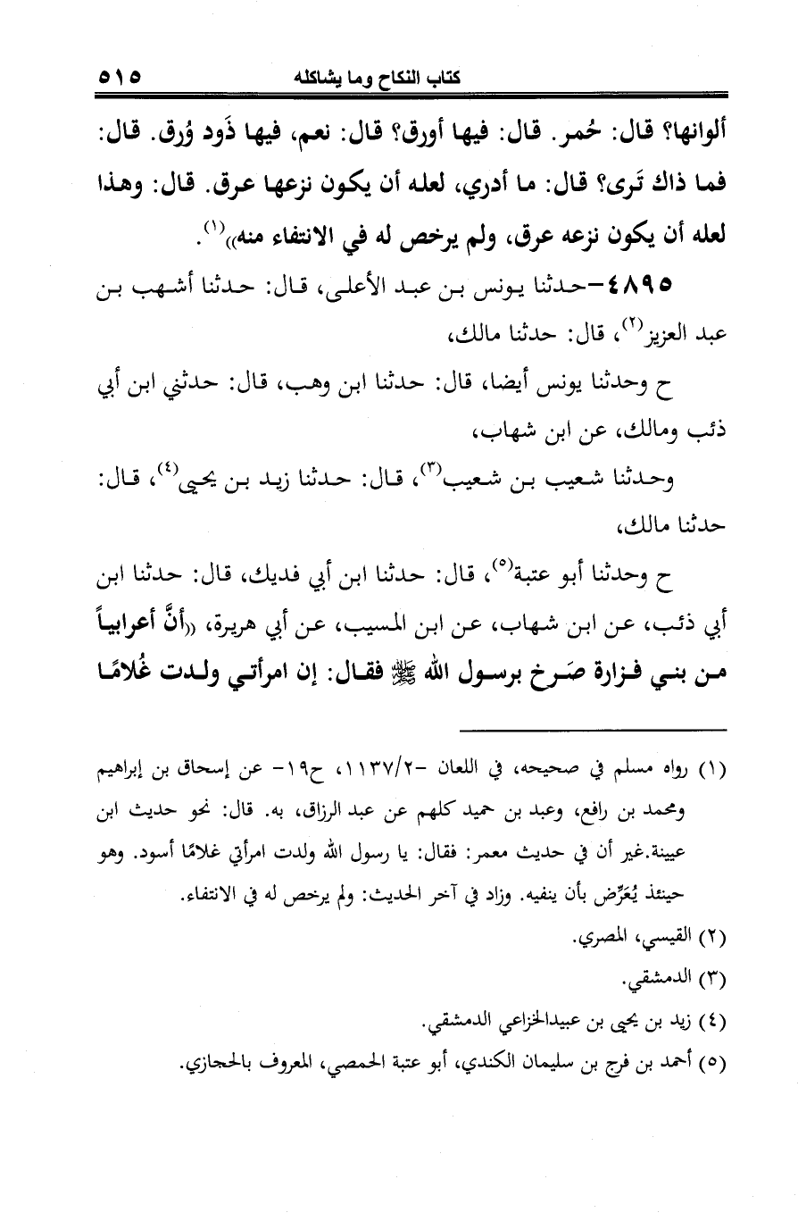 -[516]- أسود، فقال له رسول الله -صلى الله عليه وسلم-: هل لك من إبل؟ قال: نعم. قال: ما ألوانها؟ قال: حُمر، قال: هل فيها من أَورق؟ قال: إن فيها لورقا. قال: فأنّى ترى ذلك جاءها؟ قال: يا رسول الله عرق نزعها، قال: فلعلّ هذا عرق نزعه، ولم يرخص رسول الله -صلى الله عليه وسلم- في الانتفاء منه"، ولم يذكر مالك: بني فزارة. وقال: "فلعلّ ابنك نزعه عرق" (¬5).