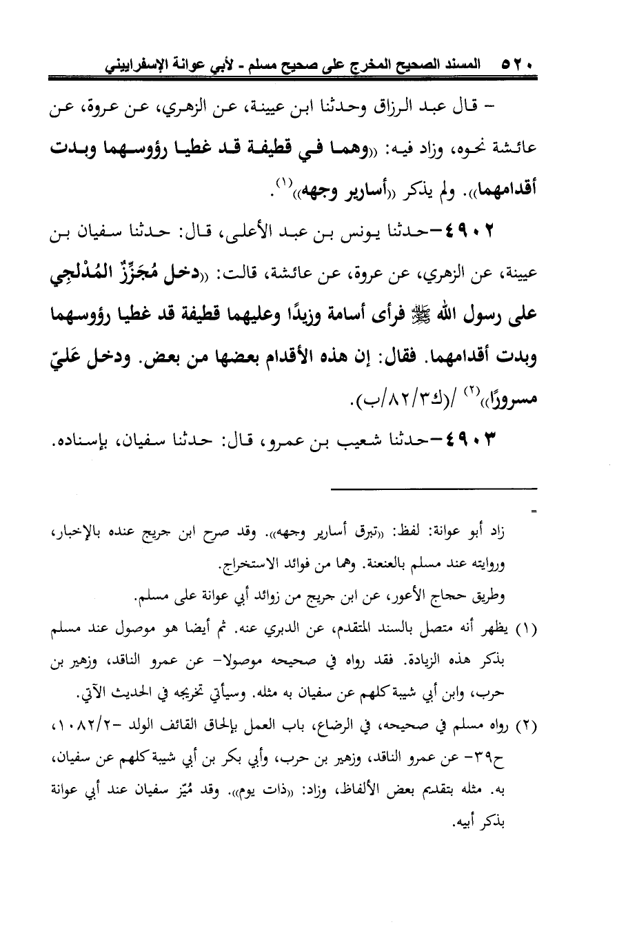 (¬1) رواه مسلم في صحيحه، في الرضاع، باب العمل بإلحاق القائف الولد -2/ 1082، ح 39 - عن عمرو الناقد، وزهير بن حرب، وأبي بكر بن أبي شيبة كلهم عن سفيان، به. مثله بتقدم بعض الألفاظ، وزاد: "ذات يوم". وقد مُيّز سفيان عند أبي عوانة بذكر أبيه.