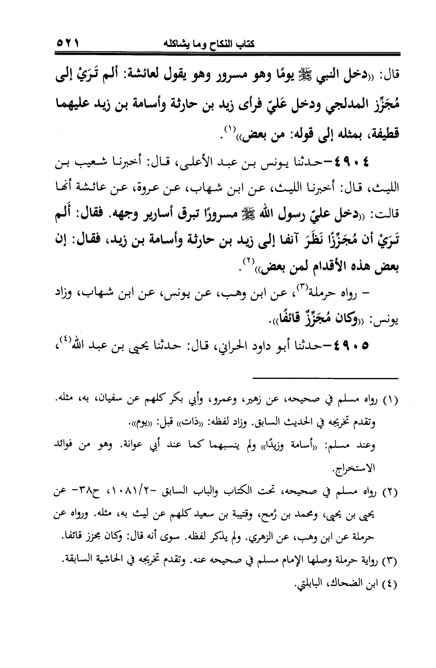 4904 - حدّثنا يونس بن عبد الأعلى، قال: أخبرنا شعيب بن اللَّيث، قال: أخبرنا اللَّيث، عن ابن شهاب، عن عروة، عن عائشة أنها قالت: "دخل عليّ رسول الله -صلى الله عليه وسلم- مسرورًا تبرق أسارير وجهه. فقال: أَلم تَرَيْ أن مُجَزِّزًا نَظَرَ آنفا إلى زيد بن حارثة وأسامة بن زيد، فقال: إن بعض هذه الأقدام لمن بعض" (¬1).