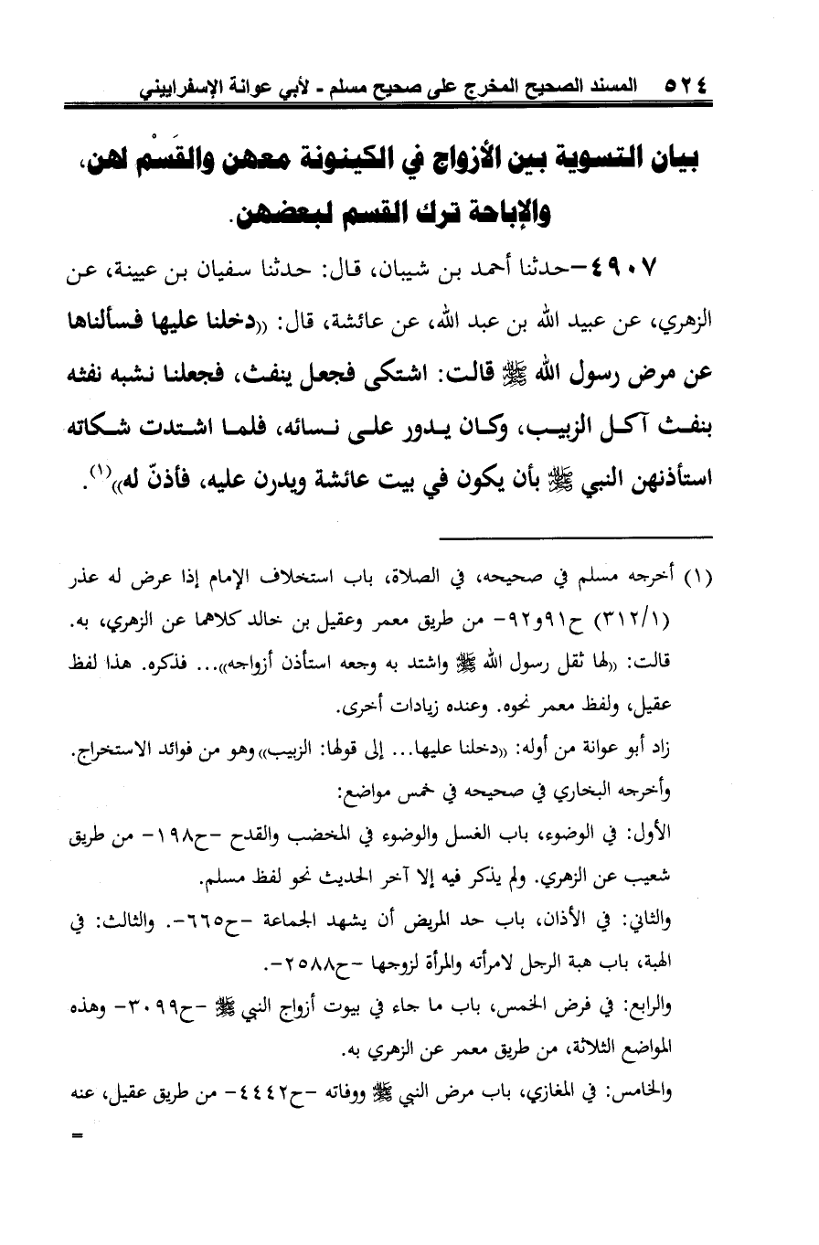 4907 - حدّثنا أحمد بن شيبان، قال: حدّثنا سفيان بن عيينة، عن الزّهريّ، عن عبيد الله بن عبد الله، عن عائشة، قال: "دخلنا عليها فسألنها عن مرض رسول الله -صلى الله عليه وسلم- قالت: اشتكى فجعل ينفث، فجعلنا نشبه نفثه بنفث آكل الزبيب، وكان يدور على نسائه، فلما اشتدت شكاته استأذنهن النّبيّ - صلى الله عليه وسلم - بأن يكون في بيت عائشة ويدرن عليه، فأذن له" (¬1).