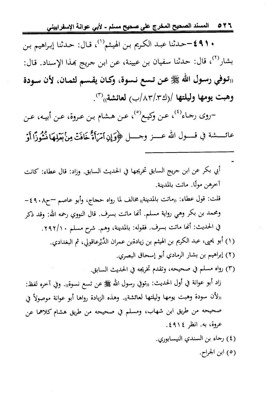 4910 - حدّثنا عبد الكريم بن الهيثم (¬1)، قال: حدّثنا إبراهيم بن بشار (¬2)، قال: حدّثنا سفيان بن عيينة، عن ابن جريج بهذا الإسناد. قال: "توفي رسول الله -صلى الله عليه وسلم- عن تسع نسوة، وكان يقسم لثمان، لأن سودة وهبت يومها وليلتها لعائشة" (¬3).