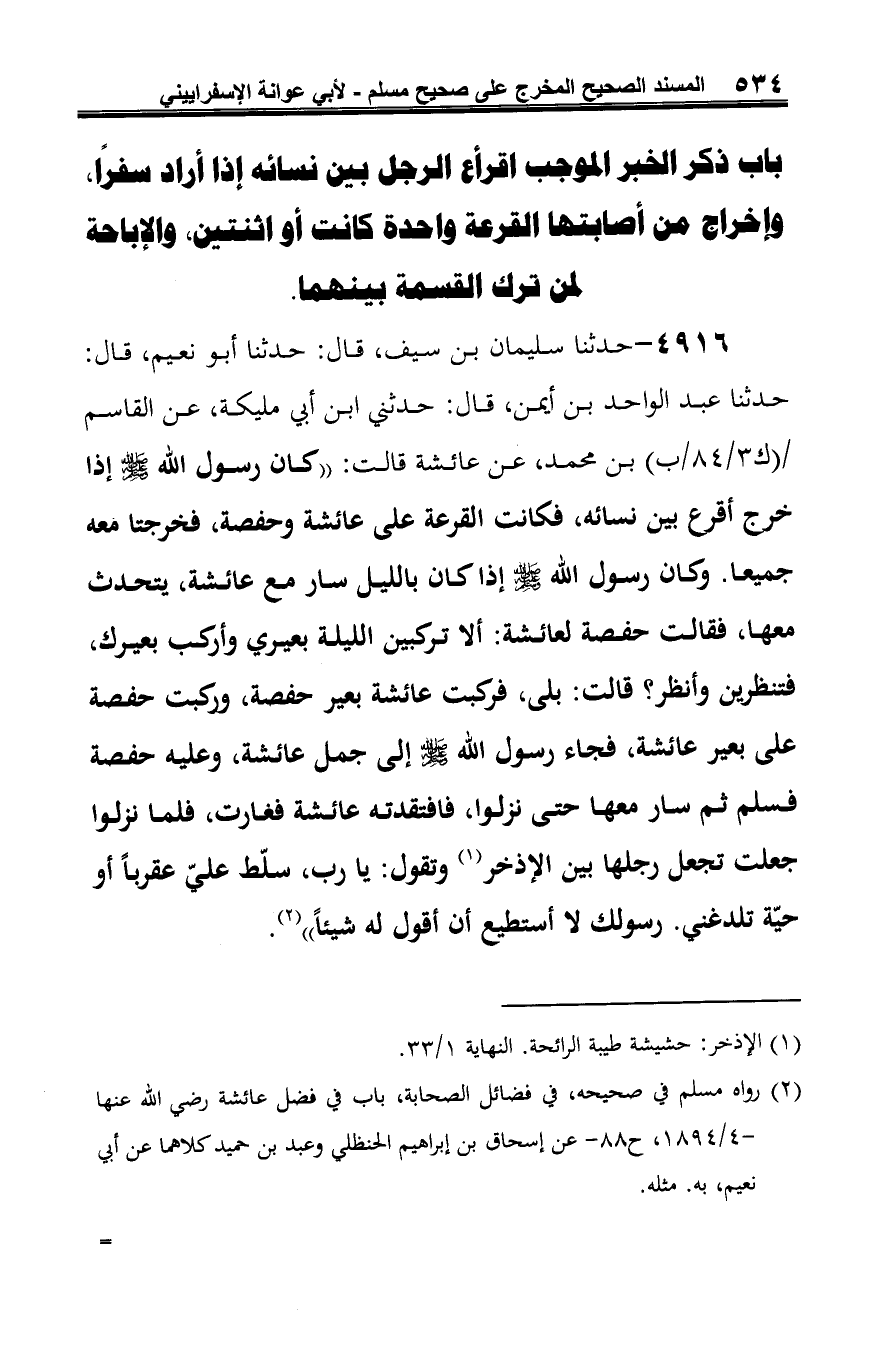 4916 - حدّثنا سليمان بن سيف، قال: حدّثنا أبو نعيم، قال: حدّثنا عبد الواحد بن أيمن، قال: حدثني ابن أبي مليكة، عن القاسم بن محمّد، عن عائشة قالت: "كان رسول الله -صلى الله عليه وسلم- إذا خرج أقرع بين نسائه، فكانت القرعة على عائشة وحفصة، فخرجتا معه جميعا. وكان رسول الله -صلى الله عليه وسلم- إذا كان باللّيل سار مع عائشة، يتحدث معها، فقالت حفصة لعائشة: ألَّا تركبين اللَّيلة بعيري وأركب بعيرك، فتنظرين وأنظر؟ قالت: بلى، فركبت عائشة بعير حفصة، وركبت حفصة على بعير عائشة، فجاء رسول الله -صلى الله عليه وسلم- إلى جمل عائشة، وعليه حفصة فسلم ثمّ سار معها حتّى نزلوا، فافتقدته عائشة فغارت، فلما نزلوا جعلت تجعل رجلها بين الإذخر (¬1) وتقول: يا رب، سلّط عليّ عقربًا أو حيّة تلدغني. رسولك لا أستطيع أن أقول له شيئًا" (¬2).