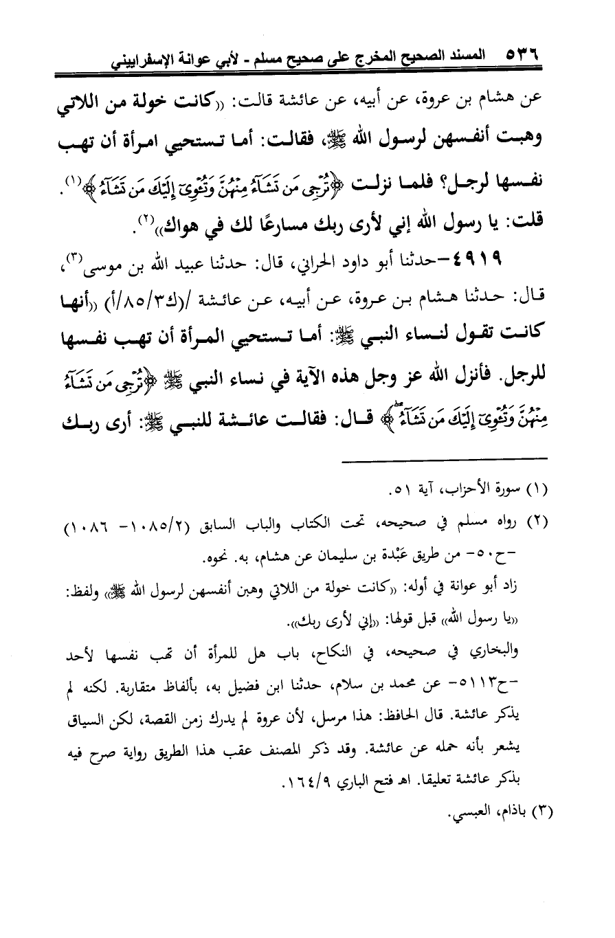 4919 - حدّثنا أبو داود الحراني، قال: حدّثنا عبيد الله بن موسى (¬1)، قال: حدّثنا هشام بن عروة، عن أبيه، عن عائشة "أنها كانت تقول لنساء النّبيّ -صلى الله عليه وسلم-: أما تستحيي المرأة أن تهب نفسها للرجل. فأنزل الله -عَزَّ وَجَلَّ- هذه الآية في نساء النّبيّ -صلى الله عليه وسلم- {تُرْجِي مَنْ تَشَاءُ مِنْهُنَّ وَتُؤْوِي إِلَيْكَ مَنْ تَشَاءُ} قال: فقالت عائشة للنبي -صلى الله عليه وسلم-: أرى ربك