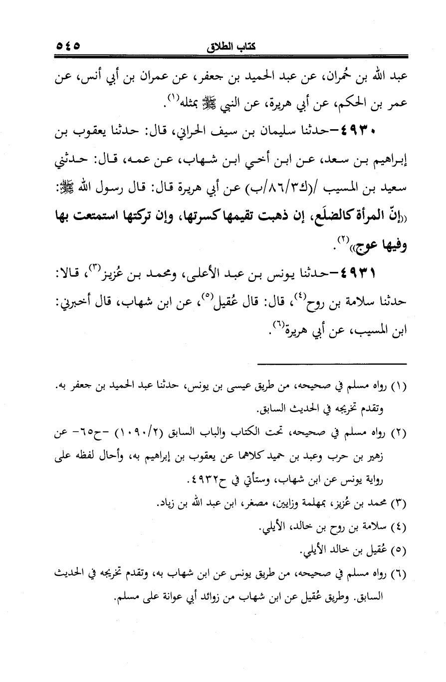 4930 - حدّثنا سليمان بن سيف الحراني، قال: حدّثنا يعقوب بن إبراهيم بن سعد، عن ابن أخي ابن شهاب، عن عمه، قال: حدثني سعيد بن المسيَّب عن أبي هريرة قال: قال رسول الله -صلى الله عليه وسلم-: "إنَّ المرأة كالضلَع، إن ذهبت تقيمها كسرتها، وإن تركتها استمتعت بها وفيها عوج" (¬1).