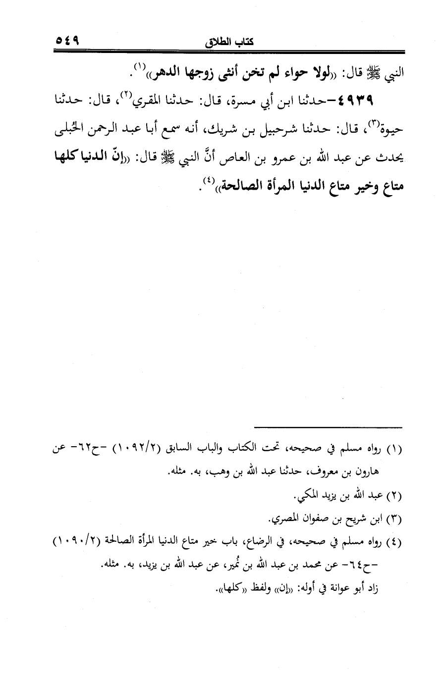 4939 - حدّثنا ابن أبي مسرة، قال: حدّثنا المقري (¬1)، قال: حدثنا حيوة (¬2)، قال: حدّثنا شرحبيل بن شريك، أنه سمع أبا عبد الرّحمن الحُبلى يحدث عن عبد الله بن عمرو بن العاص أنَّ النبي -صلى الله عليه وسلم- قال: "إنّ الدنيا كلها متاع وخير متاع الدنيا المرأة الصالحة" (¬3).