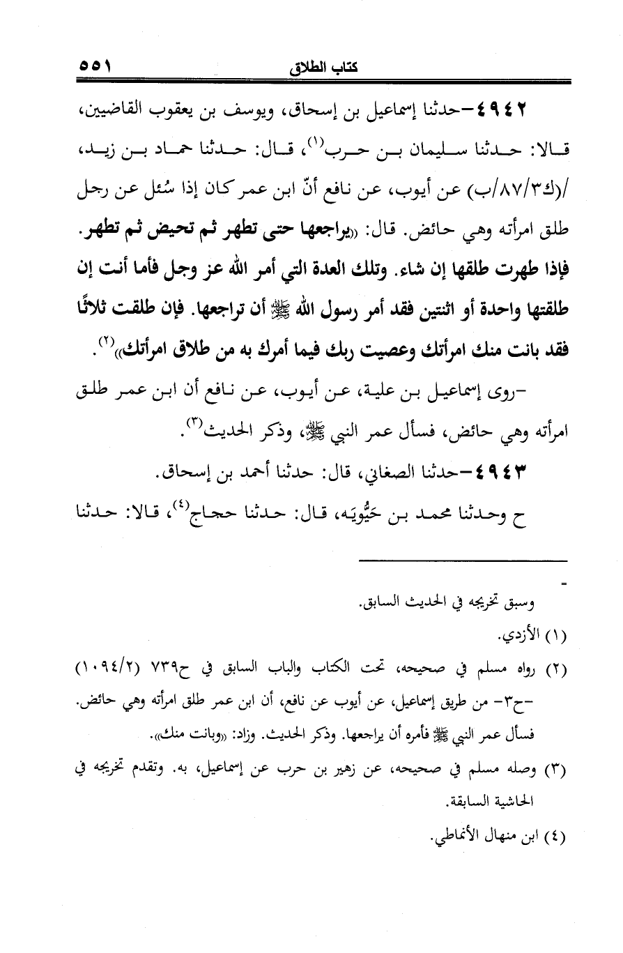 (¬2) رواه مسلم في صحيحه، تحت الكتاب والباب السابق في ح 739 (2/ 1094) - ح 3 - من طريق إسماعيل، عن أيوب عن نافع، أن أبن عمر طلق امرأته وهي حائض.