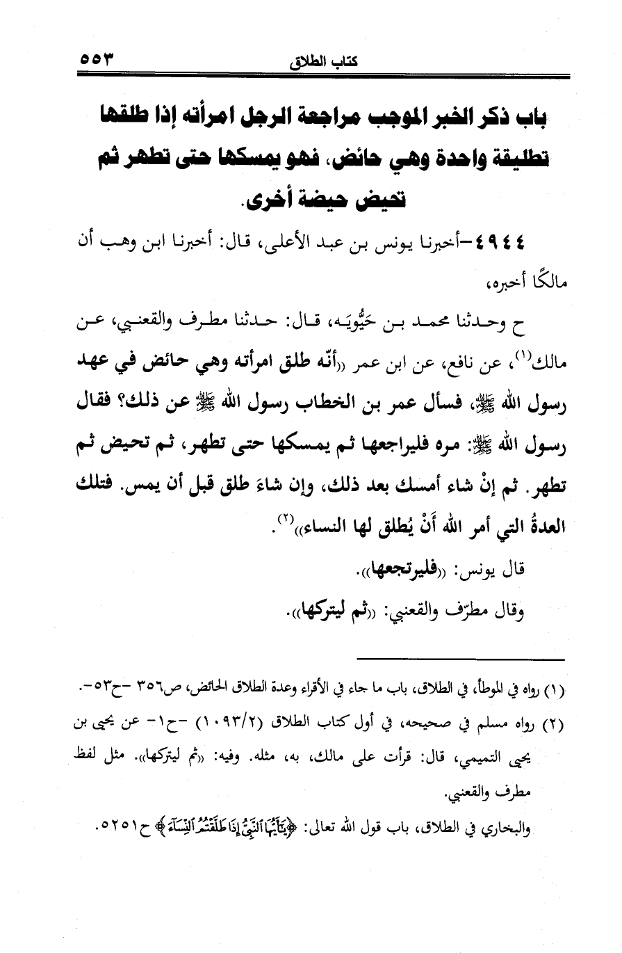 (¬2) رواه مسلم في صحيحه، في أول كتاب الطّلاق (2/ 1093) - ح 1 - عن يحيى بن يحيى التميمي، قال: قرأت على مالك، به، مثله. وفيه: "ثمّ ليتركها". مثل لفظ مطرف والقعنبي.