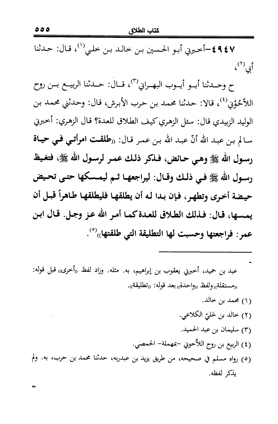 4947 - أخبرني أبو الحسين بن خالد بن خلي (¬1)، قال: حدّثنا أبي (¬2)، ح وحدثنا أبو أيوب البهراني (¬3)، قال: حدّثنا الربيع بن روح اللّاحُوْني (¬4)، قالا: حدّثنا محمّد بن حرب الأبرش، قال: وحدثني محمّد بن الوليد الزبيدي قال: سئل الزّهريُّ كيف الطّلاق للعدة؟ قال الزّهريُّ: أخبرني سالم بن عبد الله أن عبد الله بن عمر قال: "طلقت امرأتي في حياة رسول الله -صلى الله عليه وسلم- وهي حائف، فذكر ذلك عمر لرسول الله -صلى الله عليه وسلم-، فتغيظ رسول الله -صلى الله عليه وسلم- في ذلك وقال: ليراجعها ثمّ ليمسكها حتّى تحيض حيضة أخرى وتطهر، فإن بدا له أن يطلقها فليطلقها طاهرًا قبل أن يمسها، قال: فذلك الطّلاق للعدة كما أمر الله -عَزَّ وَجَلَّ-. قال ابن عمر: فراجعتها وحسبت لها التطليقة الّتي طلقتها" (¬5).
