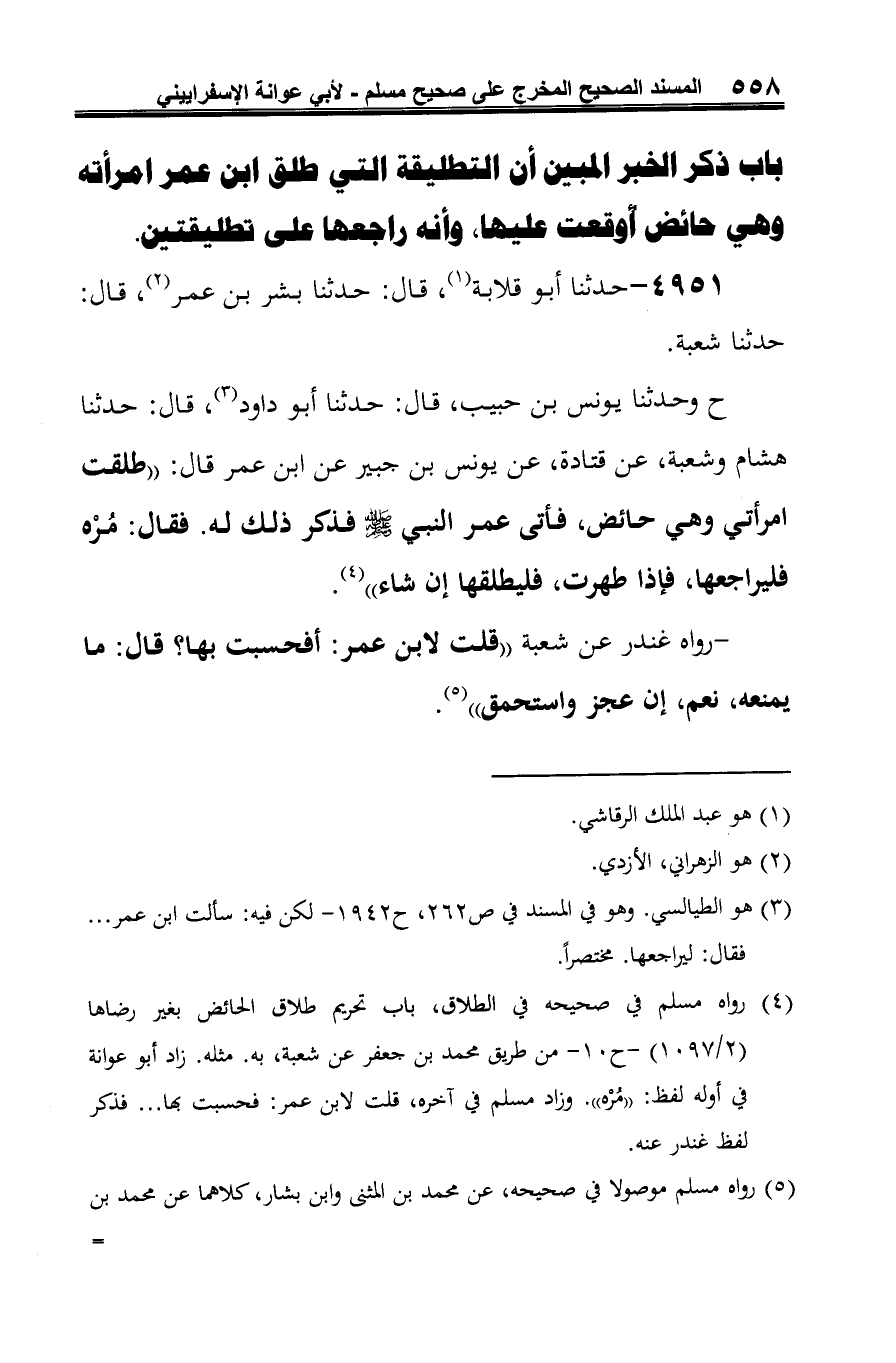 (¬4) رواه مسلم في صحيحه في الطّلاق، باب تحريم طلاق الحائض بغير رضاها (2/ 1097) - ح 10 - من طريق محمّد بن جعفر عن شعبة، به. مثله. زاد أبو عوانة في أوله لفظ: "مُرْه". وزاد مسلم في آخره، قلت لابن عمر: فحسبت بها ... فذكر لفظ غندر عنه.