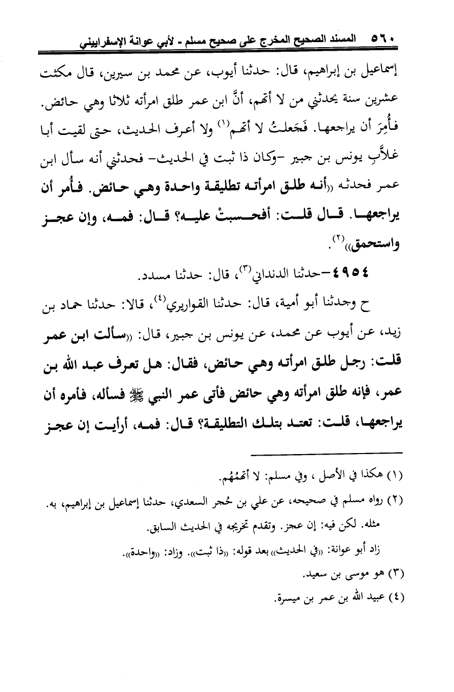 (¬3) رواه مسلم في صحيحه، عن أبي الربيع وقتيبة، قالا: حدّثنا حماد، به. وأحال لفظه على رواية إسماعيل عن أيوب المخرجة في الحديث السابق. وقال: نحوه غير أنه قال: فسأل عمر النبي -صلى الله عليه وسلم- فأمره. وتقدم تخريجه في ح 4952.