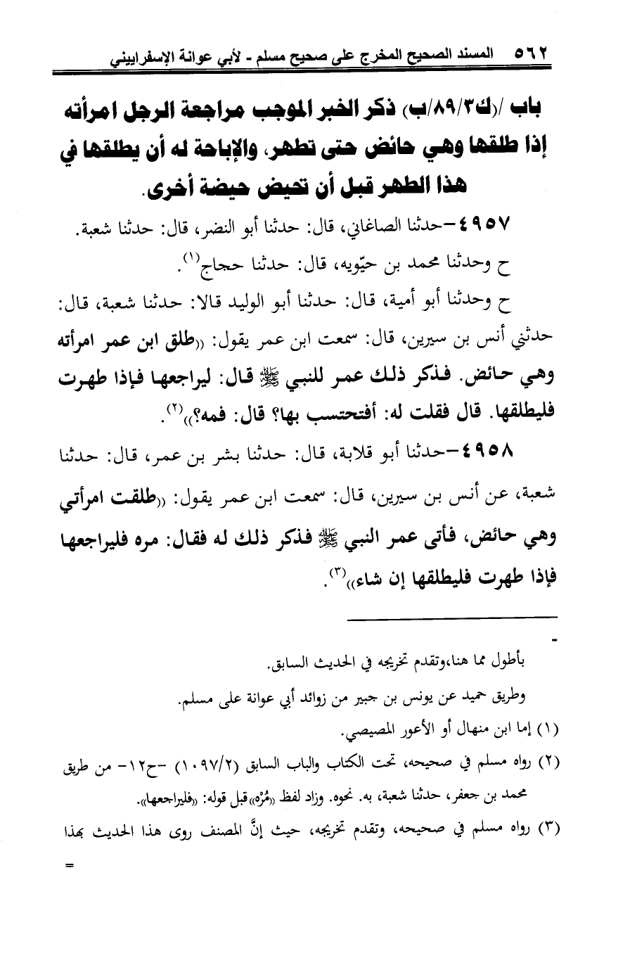 4958 - حدّثنا أبو قلابة، قال: حدّثنا بشر بن عمر، قال: حدّثنا شعبة، عن أنس بن سيرين، قال: سمعت ابن عمر يقول: "طلقت امرأتي وهي حائض، فأتى عمر النّبيّ -صلى الله عليه وسلم- فذكر ذلك له فقال: مره فليراجعها فإذا طهرت فليطلقها إن شاء" (¬1).