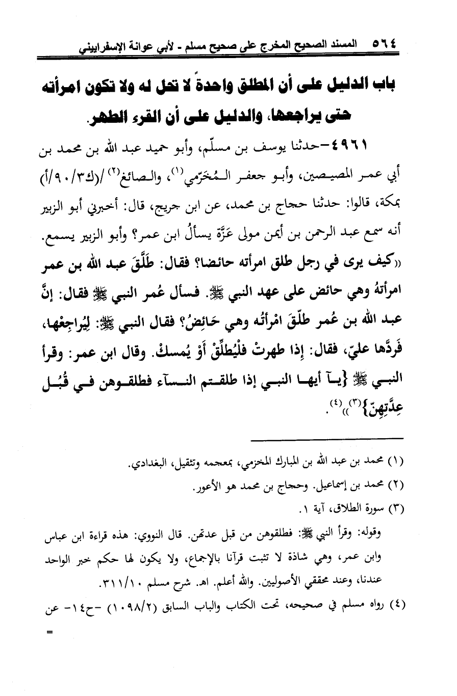 "كيف يرى في رجل طلق امرأته حائضا؟ فقال: طَلَّقَ عبد الله بن عمر امرأتهُ وهي حائض على عهد النّبيّ -صلى الله عليه وسلم-. فسأل عُمر النّبيّ -صلى الله عليه وسلم- فقال: إن عبد الله بن عُمر طلّقَ امْرأتَهُ وهي حَائِضُ؟ فقال النّبيّ -صلى الله عليه وسلم-: لِيُراجِعْها، فَردَّها عليّ، فقال: إِذا طهرتْ فلْيُطلِّقْ أَوْ يُمسكْ. وقال ابن عمر: وقرأ النّبيّ -صلى الله عليه وسلم- {يَاأَيُّهَا النَّبِيُّ إِذَا طَلَّقْتُمُ النِّسَاءَ} (¬3) " (¬4).