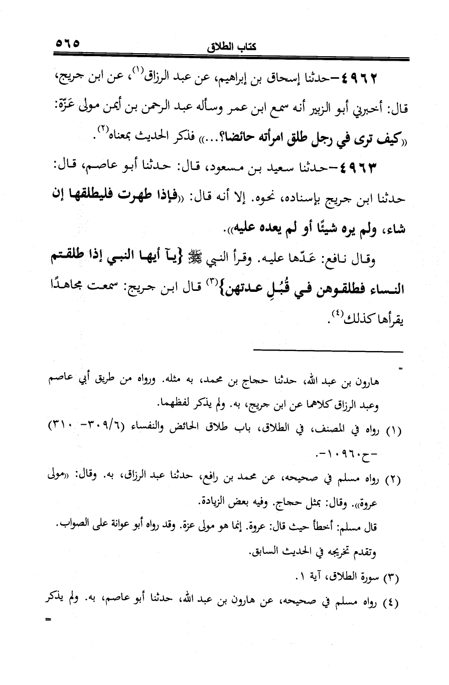 4962 - حدّثنا إسحاق بن إبراهيم، عن عبد الرزاق (¬1)، عن ابن جريج، قال: أخبرني أبو الزبير أنه سمع ابن عمر وسأله عبد الرّحمن بن أيمن مولى عَزّة: "كيف ترى في رجل طلق امرأته حائضًا؟ ... " فذكر الحديث بمعناه (¬2).