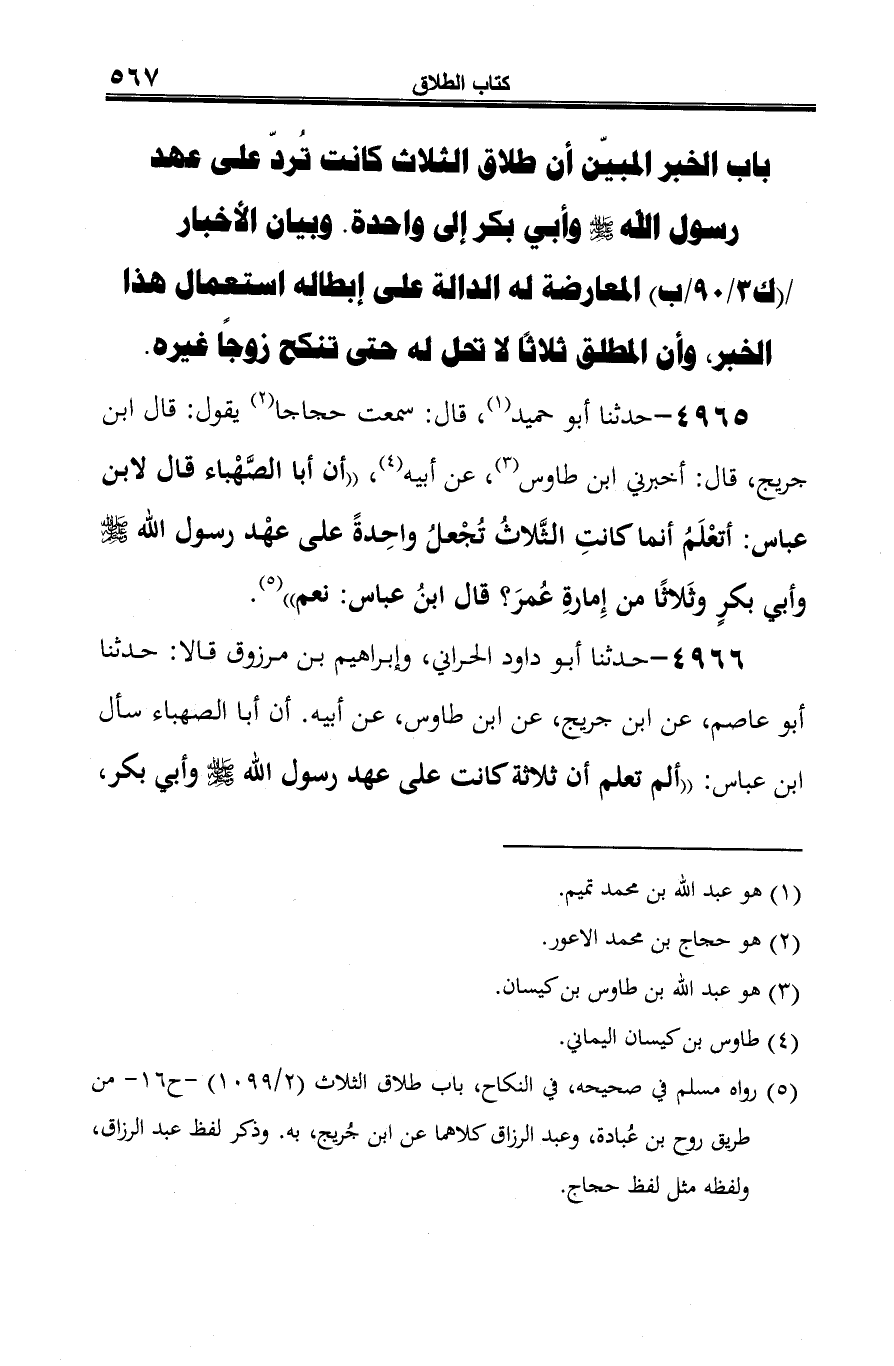 4965 - حدّثنا أبو حميد (¬1)، قال: سمعت حجاجا (¬2) يقول: قال ابن جريج، قال: أخبرني ابن طاوس (¬3)، عن اُبيه (¬4)، "أن أبا الصَّهْباء قال لابن عبّاس: أتعْلَمُ أنما كانتِ الثَّلاثُ تُجْعلُ واحِدةً على عهْد رسول الله -صلى الله عليه وسلم- وأبي بكرٍ وثَلَاثًا من إِمارةِ عُمرَ؟ قال ابنُ عبّاس: نعم" (¬5).