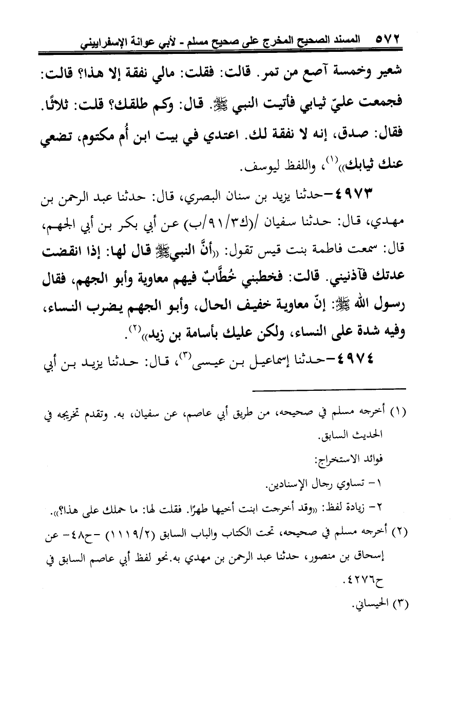 4973 - حدثنا يزيد بن سنان البصري، قال: حدثنا عبد الرحمن بن مهدي، قال: حدثنا سفيان عن أبي بكر بن أبي الجهم، قال: سمعت فاطمة بنت قيس تقول: "أنَّ النبي -صلى الله عليه وسلم- قال لها: إذا انقضت عدتك فآذنيني. قالت: فخطبني خُطَّابٌ فيهم معاوية وأبو الجهم، فقال رسول الله -صلى الله عليه وسلم-: إنّ معاوية خفيف الحال، وأبو الجهم يضرب النساء، وفيه شدة على النساء، ولكن عليك بأسامة بن زيد" (¬1).