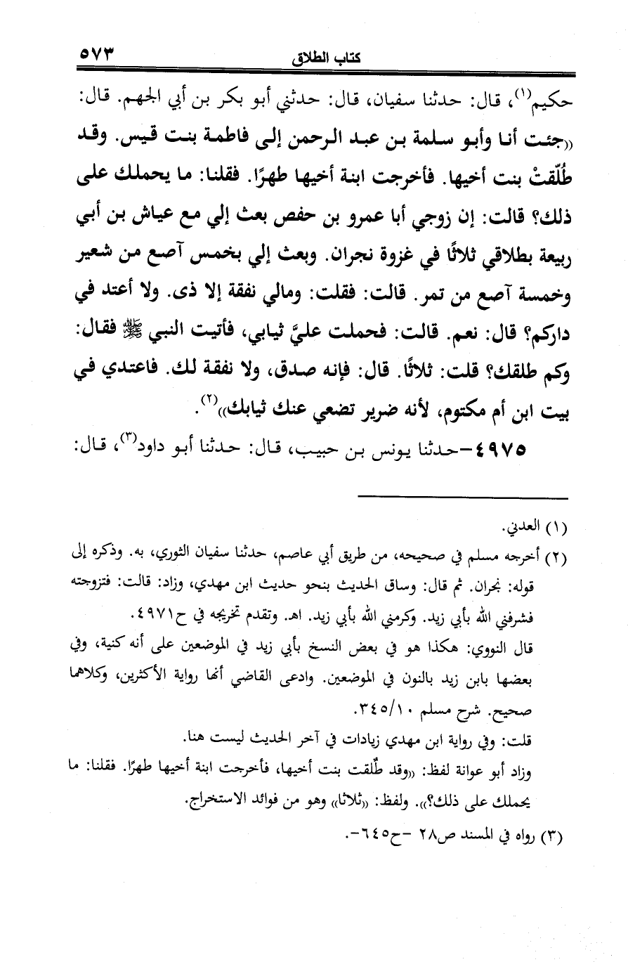 -[574]- حدثنا شعبة، قال: أخبرني أبو بكر بن أبي الجهم، قال: "دخلت أنا وأبو سلمة بن عبد الرحمن على فاطمة بنت قيس، زمن ابن الزبير (¬2)، فسألناها عن المطلقة ثلاثًا: هل لها نفقة؟ قالت: طلقني زوجي ثلاثًا، ولم يجعل لى سكنى ولا نفقة. فأتيت رسول الله -صلى الله عليه وسلم- فذكرت ذلك له، فقلت: إنه لم يجعل لي سكنى ولا نفقة؟ قال: صدق، اعتدي في بيت ابن أم مكتوم، فإنه رجل ضرير البصر، وعسى أن تُلقين عنك ثيابك أو بعض ثيابك. قالت: فقلت: فلما انقضت عدتي، خطبني أبو الجهم رجل من قريش ومعاوية بن أبي سفيان، فأتيت رسول الله -صلى الله عليه وسلم- فذكرت ذلك له، فقال رسول الله -صلى الله عليه وسلم-: أما أبو الجهم فهو رجل شديد على النساء، وأما معاوية فرجل لا مال له. قالت: ثم خطبني أسامة بن زيد فتزوجته فبارك الله عز وجل لي في أسامة" (¬3).
