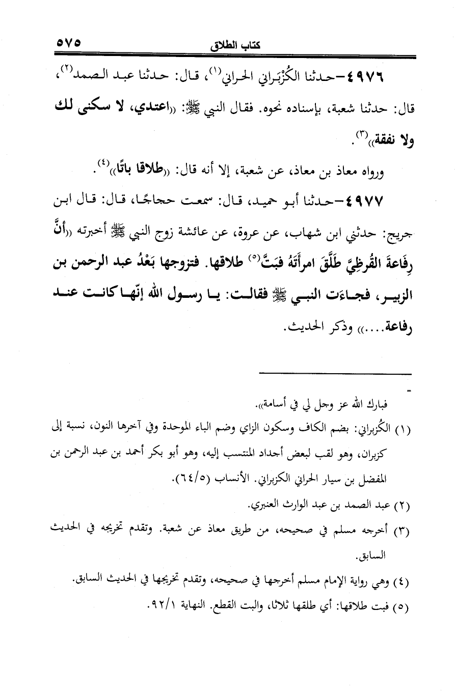 4976 - حدثنا الكُزْبَراني الحراني (¬1)، قال: حدثنا عبد الصمد (¬2)، قال: حدثنا شعبة، بإسناده نحوه. فقال النبي -صلى الله عليه وسلم-: "اعتدي، لا سكنى لك ولا نفقة" (¬3).