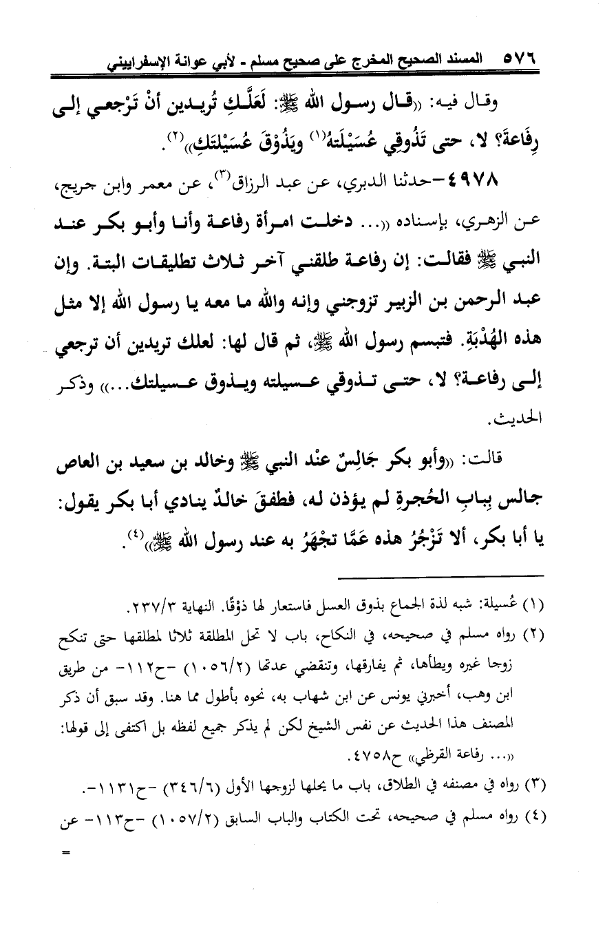 4978 - حدثنا الدبري، عن عبد الرزاق (¬1)، عن معمر وابن جريج، عن الزهري، بإسناده " ... دخلت امرأة رفاعة وأنا وأبو بكر عند النبي -صلى الله عليه وسلم- فقالت: إن رفاعة طلقني آخر ثلاث تطليقات البتة. وإن عبد الرحمن بن الزبير تزوجني وإنه والله ما معه يا رسول الله إلا مثل هذه الهُدْبَةِ. فتبسم رسول الله -صلى الله عليه وسلم-، ثم قال لها: لعلك تريدين أن ترجعي إلى رفاعة؟ لا، حتى تذوقي عسيلته ويذوق عسيلتك ... " وذكر الحديث.