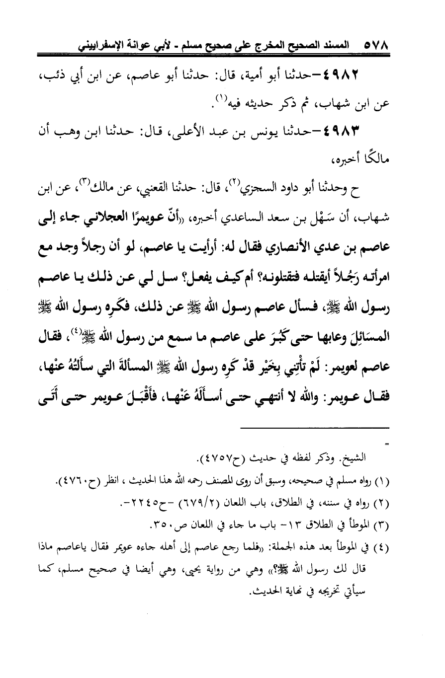(¬3) في الموطأ بعد هذه الجملة: "فلما رجع عاصم إلى أهله جاءه عويمر فقال يا عاصم ماذا قال لك رسول الله -صلى الله عليه وسلم-؟ " وهي من رواية يحيى، وهي أيضا في صحيح مسلم، كما سيأتي تخريجه في نهاية الحديث.