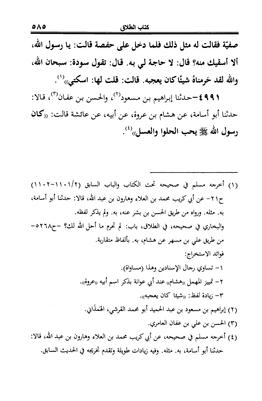 4991 - حدثنا إبراهيم بن مسعود (¬1)، والحسن بن عفان (¬2)، قالا: حدثنا أبو أسامة، عن هشام بن عروة، عن أبيه، عن عائشة قالت: "كان رسول الله -صلى الله عليه وسلم- يحب الحلوا والعسل" (¬3).